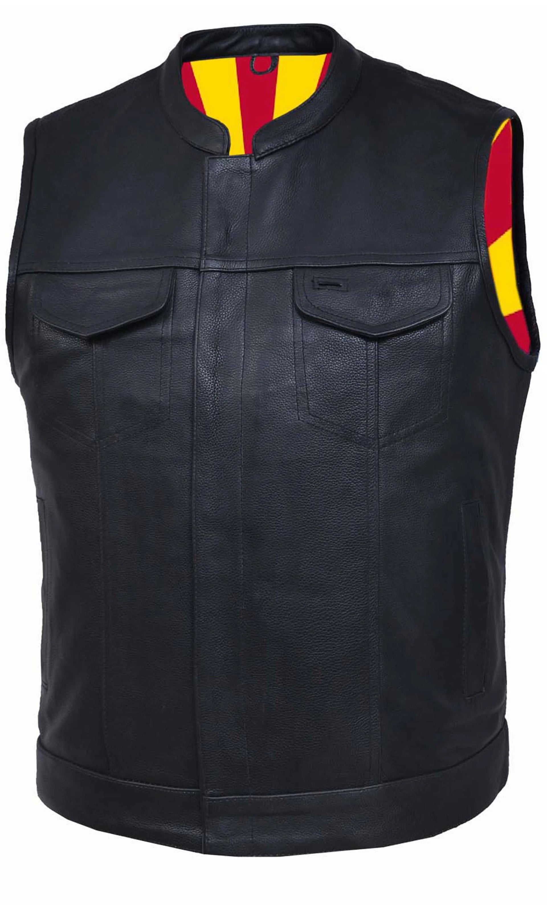 The Men's Arizona Flag Liner Club Vest by Unik Premium celebrates national pride while offering practical features. Made from cowhide leather with a USA flag liner, it includes four exterior pockets, two inside concealed carry pockets, a zip snap main closure, antique brass hardware, and a one-panel back, providing both style and functionality for various settings.