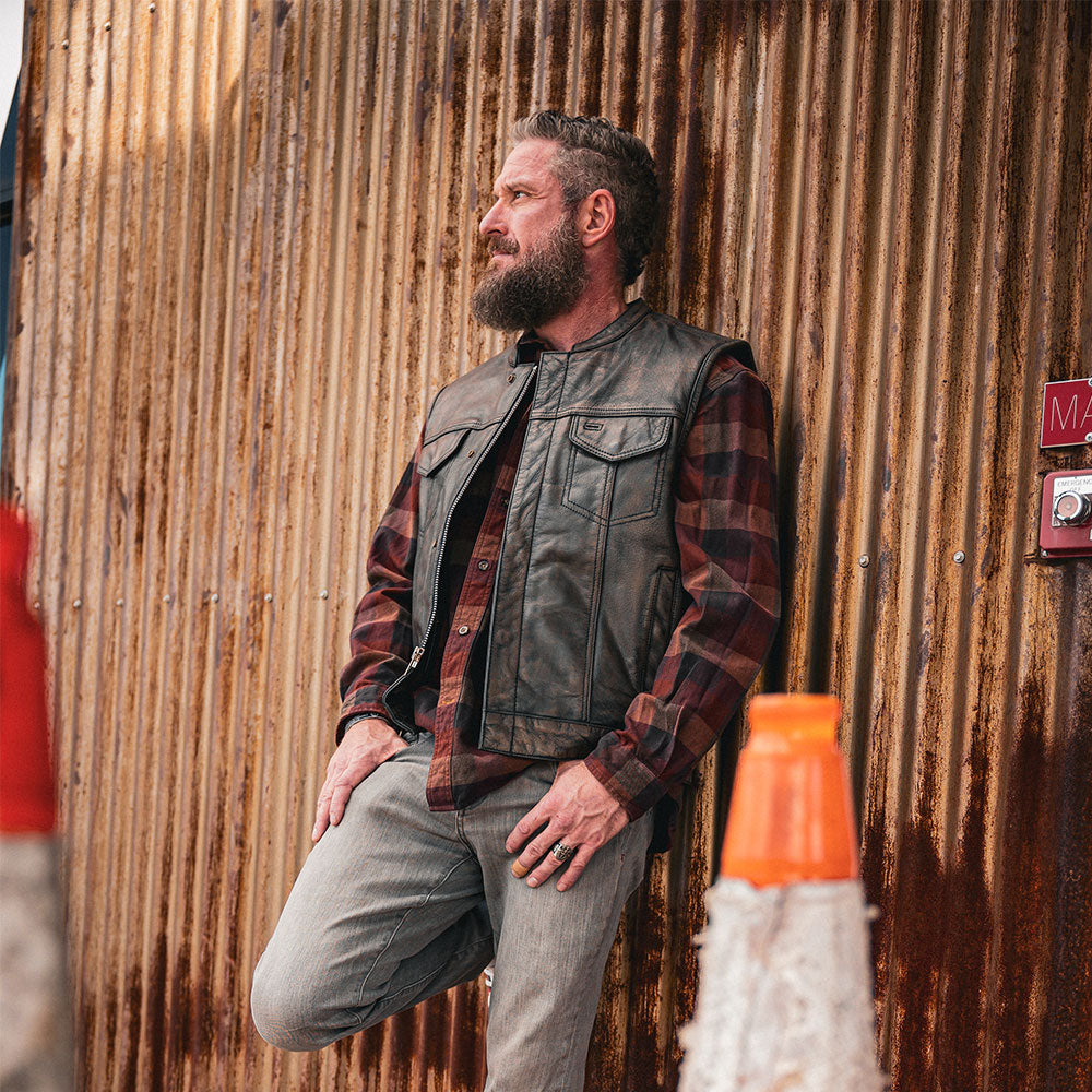 The Men's Brown Club Vest by Unik Premium offers rugged durability with classic design elements. Crafted from buffalo leather, it features two outside chest pockets, two outside hand warmer pockets, two inside concealed carry pockets, antique brass hardware, a quick access gun pocket, front zip and snap main closure, and a one-panel back, making it a versatile and stylish choice for various settings.