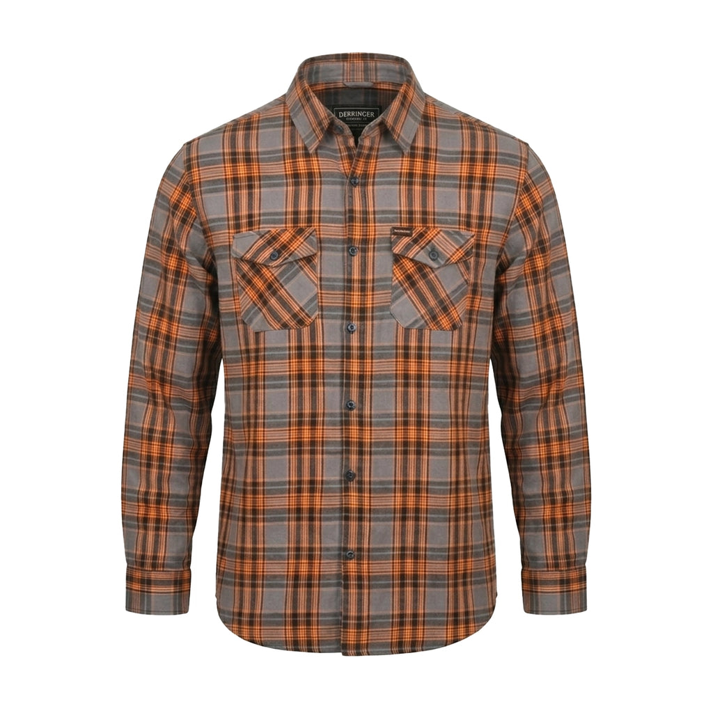 This rugged men's motorcycle flannel shirt is crafted from 100% cotton flannel, delivering all-day breathability and lasting comfort. Featuring a bold gray and orange tartan plaid pattern, snap-front closure with black hardware, and a classic point collar, it blends Western workwear tradition with everyday versatility. Dual flap chest pockets and snap cuffs complete this dependable, style-forward flannel.