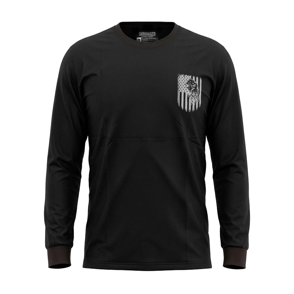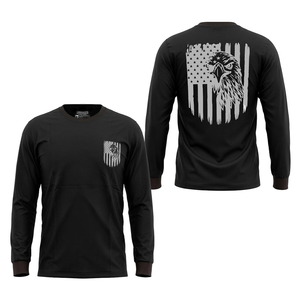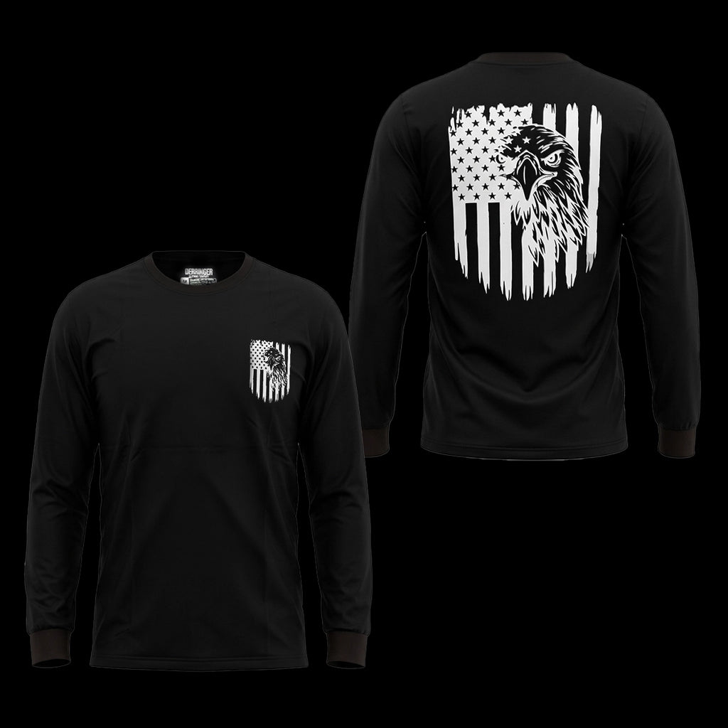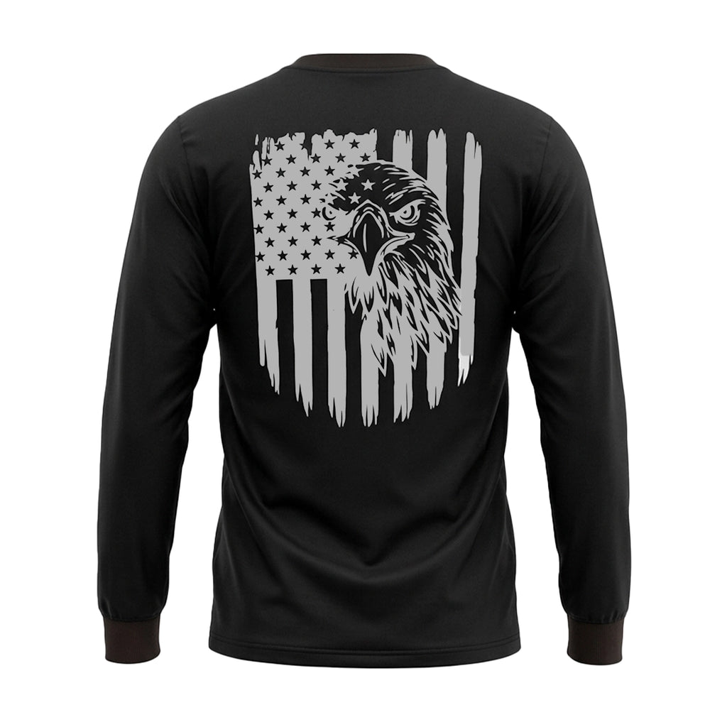 Designed for the patriotic rider, veteran, and everyday American, this men's long sleeve shirt is built from 100% ring-spun cotton that stays soft, breathable, and shape-retaining wash after wash. An oversized distressed bald eagle merged with a tattered stars-and-stripes flag is screen-printed across the full back panel, while a scaled-down chest graphic keeps the front sharp and intentional. The crew neck collar and ribbed cuffs deliver a clean silhouette that works just as well under a leather vest as it does worn solo on game day.