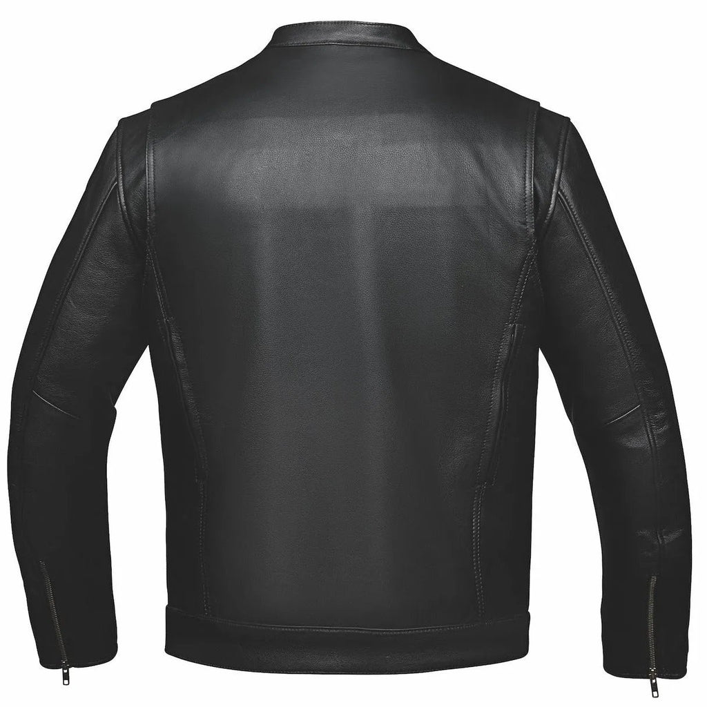 Loaded with functionality, it includes two outside chest pockets, two outside hand warmer pockets, and two inside concealed carry pockets for generous organized storage. Zippered cuffs, a full sleeve zip-out liner, hidden zip and snap closure, Euro Collar, black hardware, and built-in hanging loop complete this motorcycle jacket for men with aggressive club-style character and all-weather versatility.
