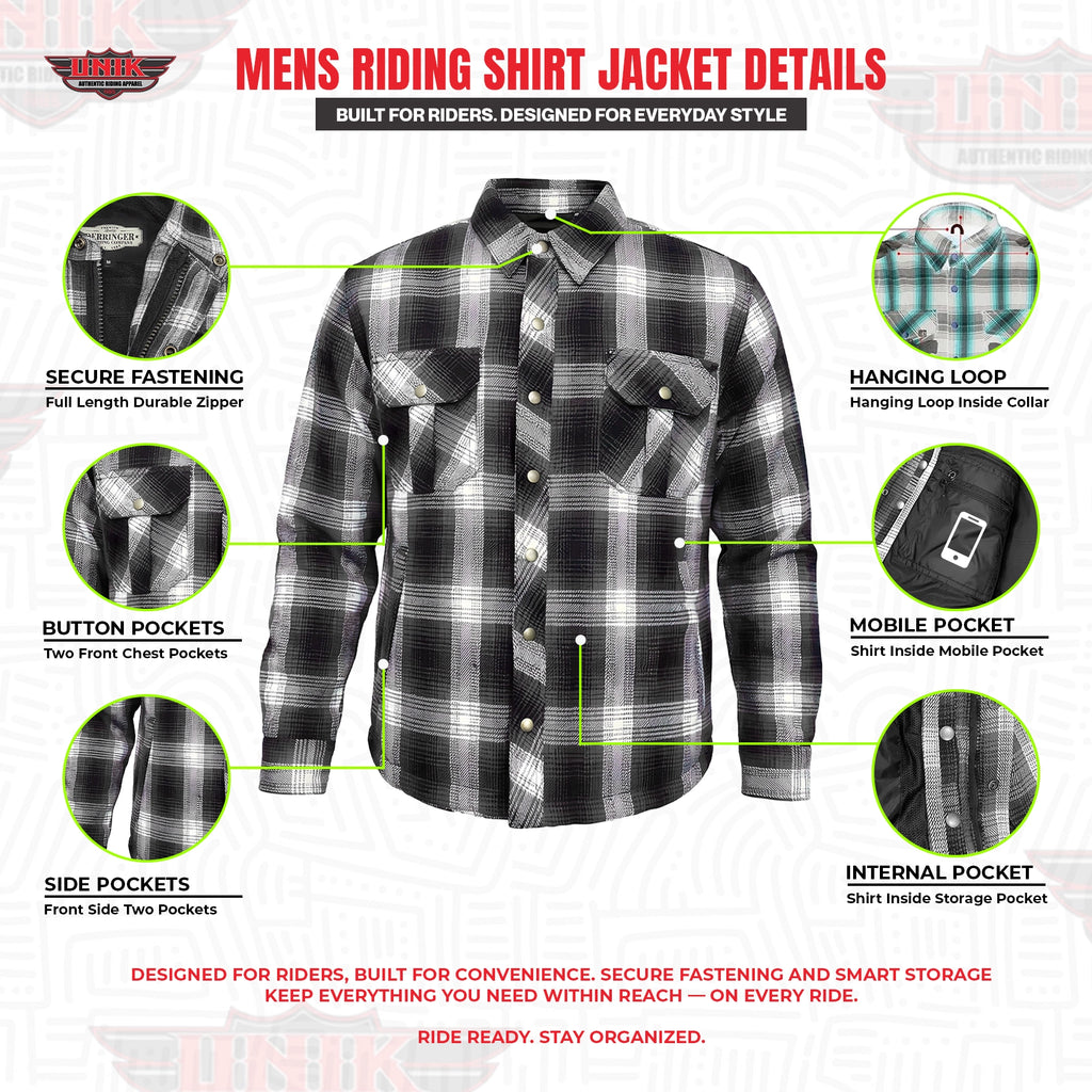 The Streetguard Flannel combines classic style with practical functionality for riders on the go. Crafted from 100% cotton, this versatile jacket features two front chest pockets, two side pockets, and two concealed carry pockets for secure storage. A dedicated mobile pocket keeps your phone accessible, while the front zip and snap closure offer easy layering. Antique silver hardware adds rugged appeal, and the interior hanging loop keeps the jacket organized. Built for the biker lifestyle.